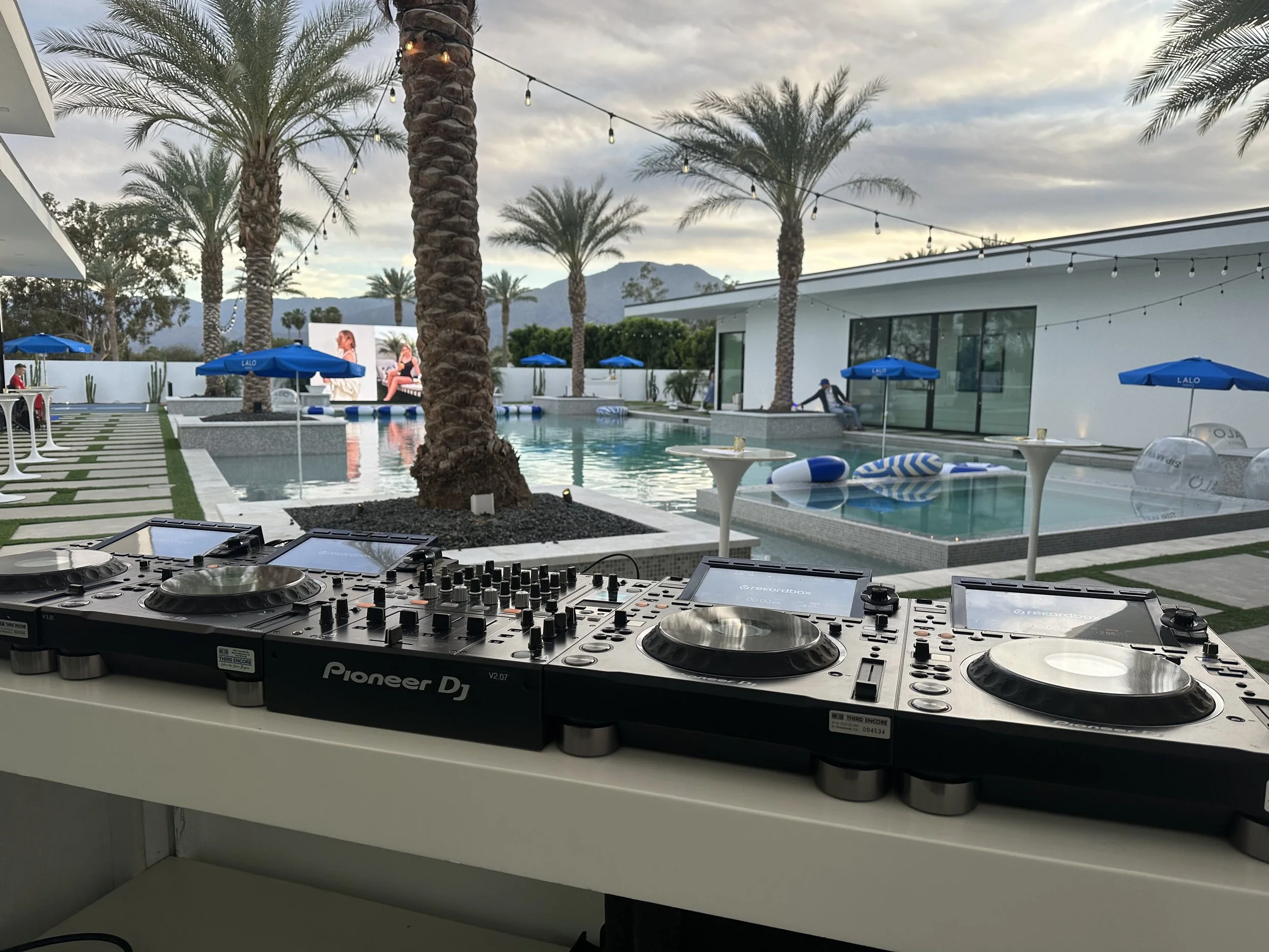 For this event, we installed a professional-grade DJ booth featuring industry-leading Pioneer DJ equipment, giving performers everything they needed to deliver a high-energy set. Positioned poolside, the setup created a vibrant focal point while maintaining clean aesthetics that matched the luxury environment.
